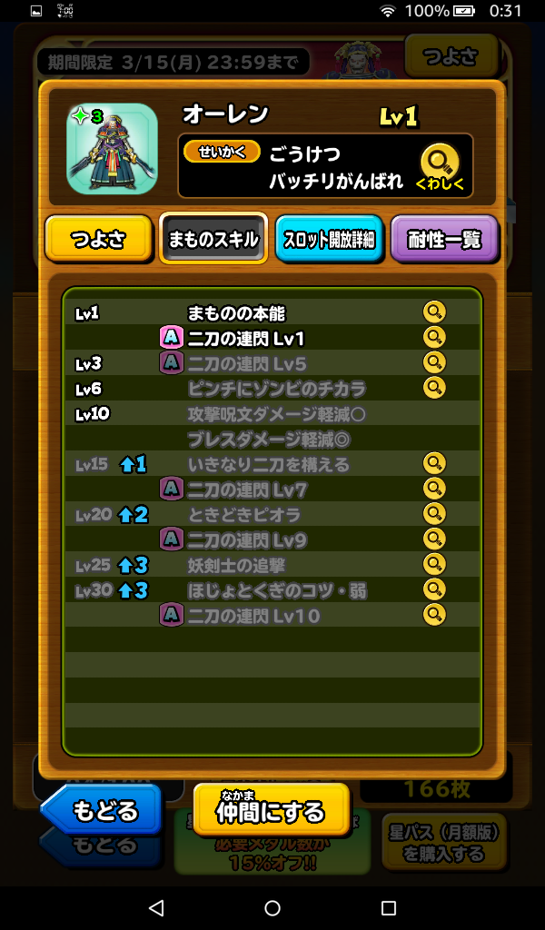 妖剣士オーレンのスキルスロット。剣のこうげきとくぎAとほじょとくぎA。